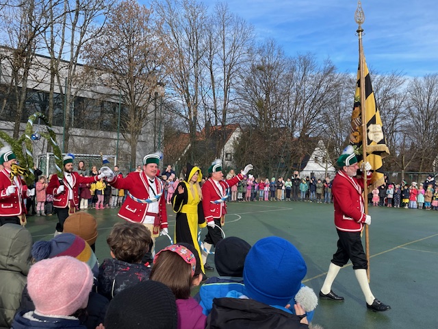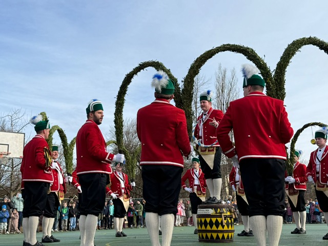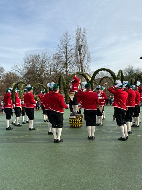 Am 12. Februar durften wir etwas ganz Besonderes erleben: Die Münchner Schäffler kamen zu Besuch und traten auf dem Sportplatz unserer Grundschule auf. Die mutigen Tänzerinnen und Tänzer zogen mit farbenfrohen Trachten, mitreißender Musik und eindrucksvollen Bewegungen die Aufmerksamkeit aller Schülerinnen und Schüler auf sich. Schon beim ersten Rhythmus der Schäfflermusik erfüllte eine fröhliche, ausgelassene Stimmung den Platz.